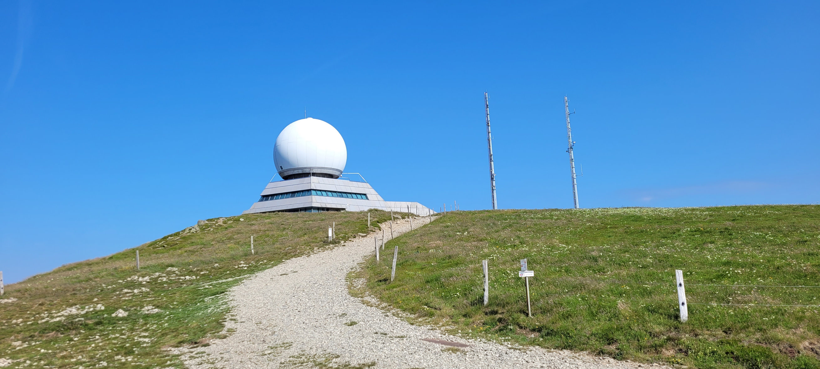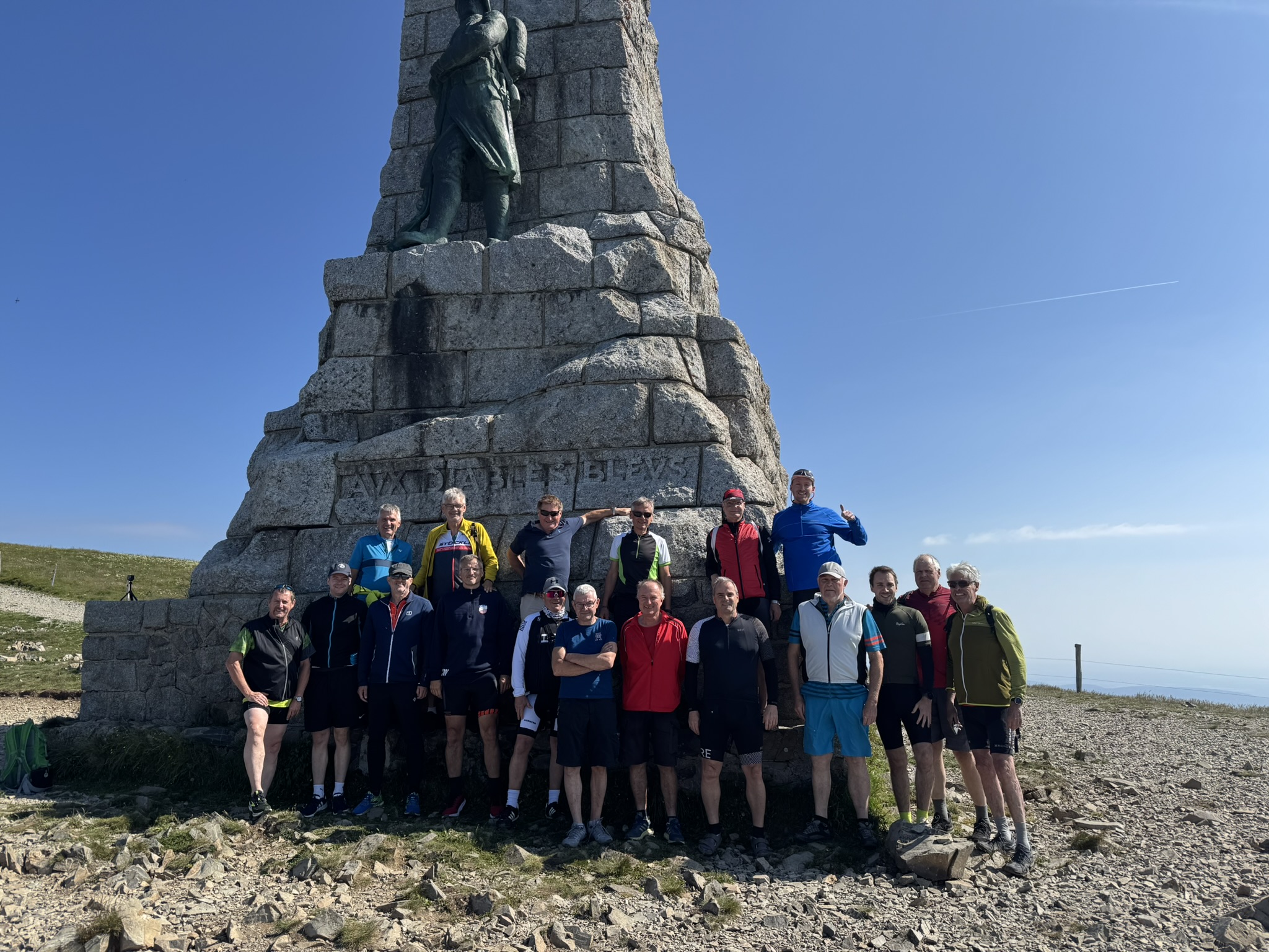 Erstmal ging es zu Fuß weiter auf den Gipfel des Grand Ballon, der mit dem Rad nicht zu erklimmen ist. Vorbei an der Radarstation fanden sich nach und nach alle ein am steinernen Denkmal für das Gruppenfoto. Ein Höhepunkt schon ganz zu Beginn und ohne größere Anstrengung.