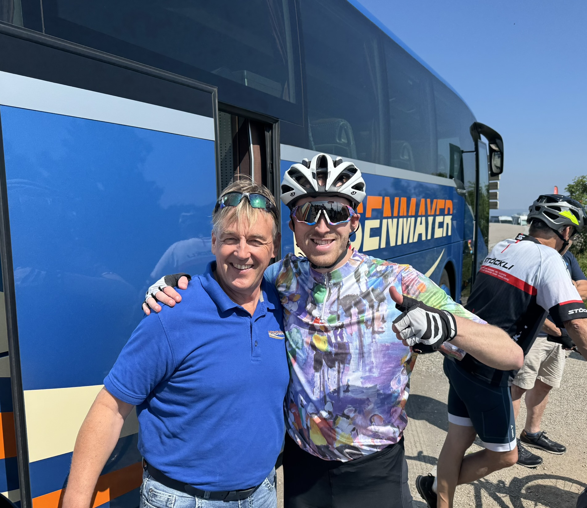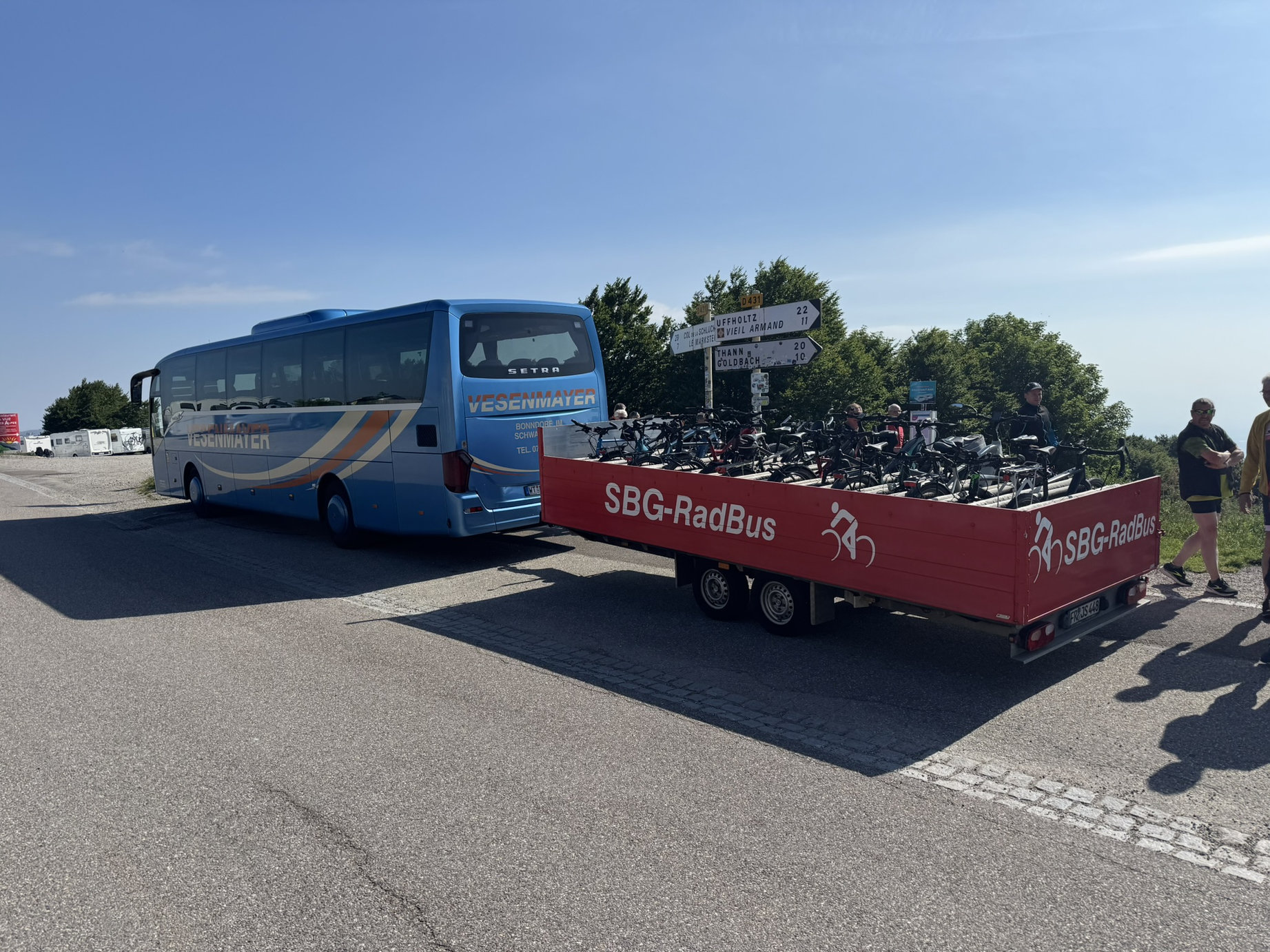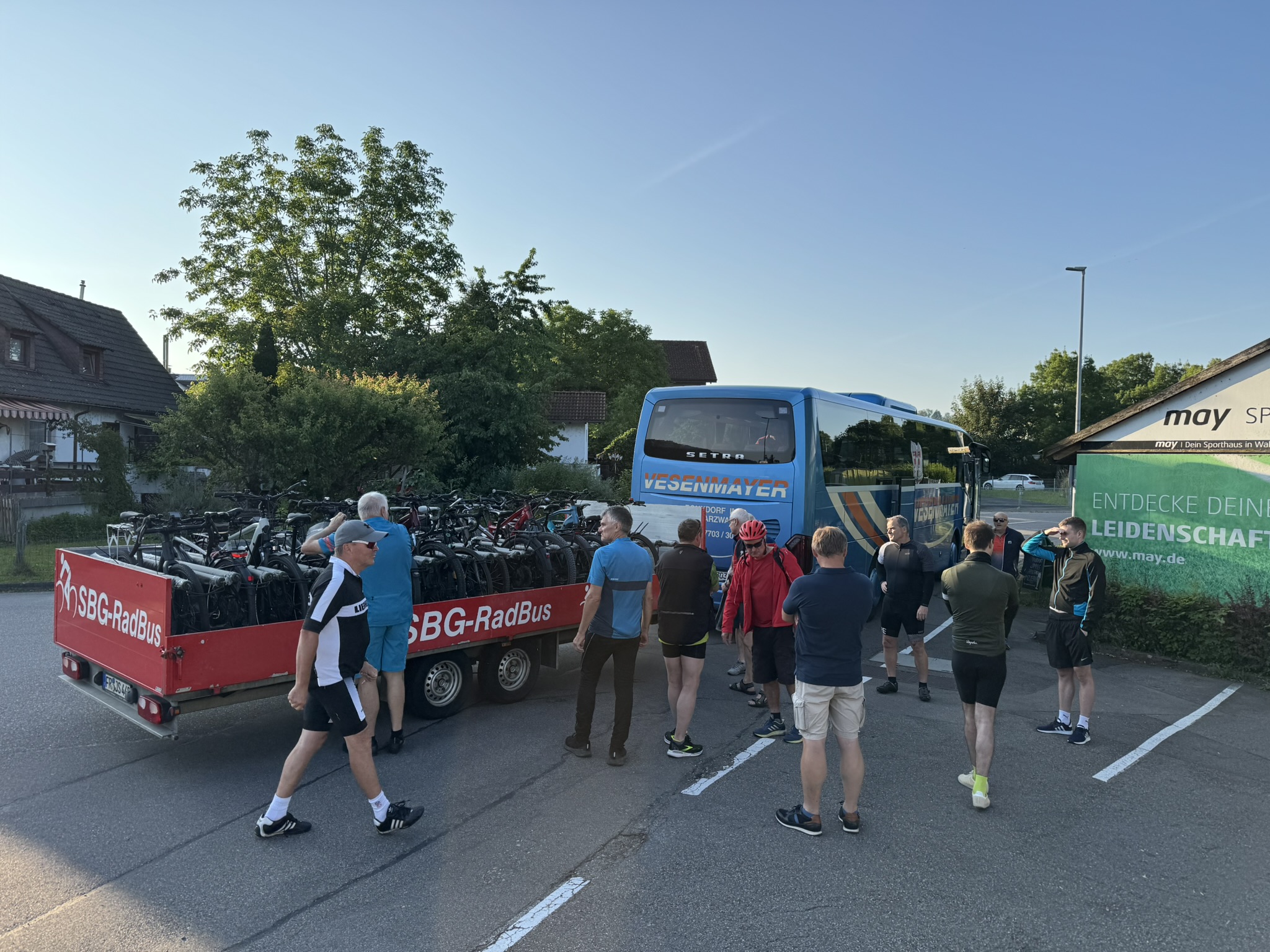 Donnerstag, 6:15h. Es war bereits sonnig und angenehm. Ein sehr warmer Tag kündigte sich an. Die Lauchringer und Geislinger trafen sich pünktlich. Der Bus kam, wie bestellt auf 6:30h. In der Zwischenzeit wurden weitere Räder verladen. 6:50h am VfB-Parkplatz in Waldshut warteten die dortigen Teilnehmer gespannt auf die Ankunft des Riesengespanns – Bus und Radanhänger. Ein großes und freudiges „Hallo“ folgte. Die restlichen Räder waren bald festgezurrt.