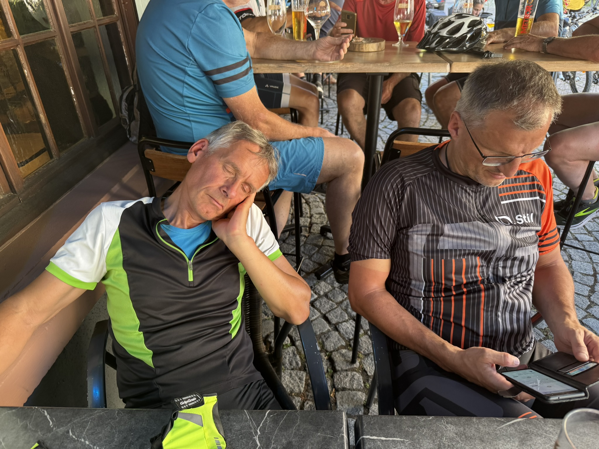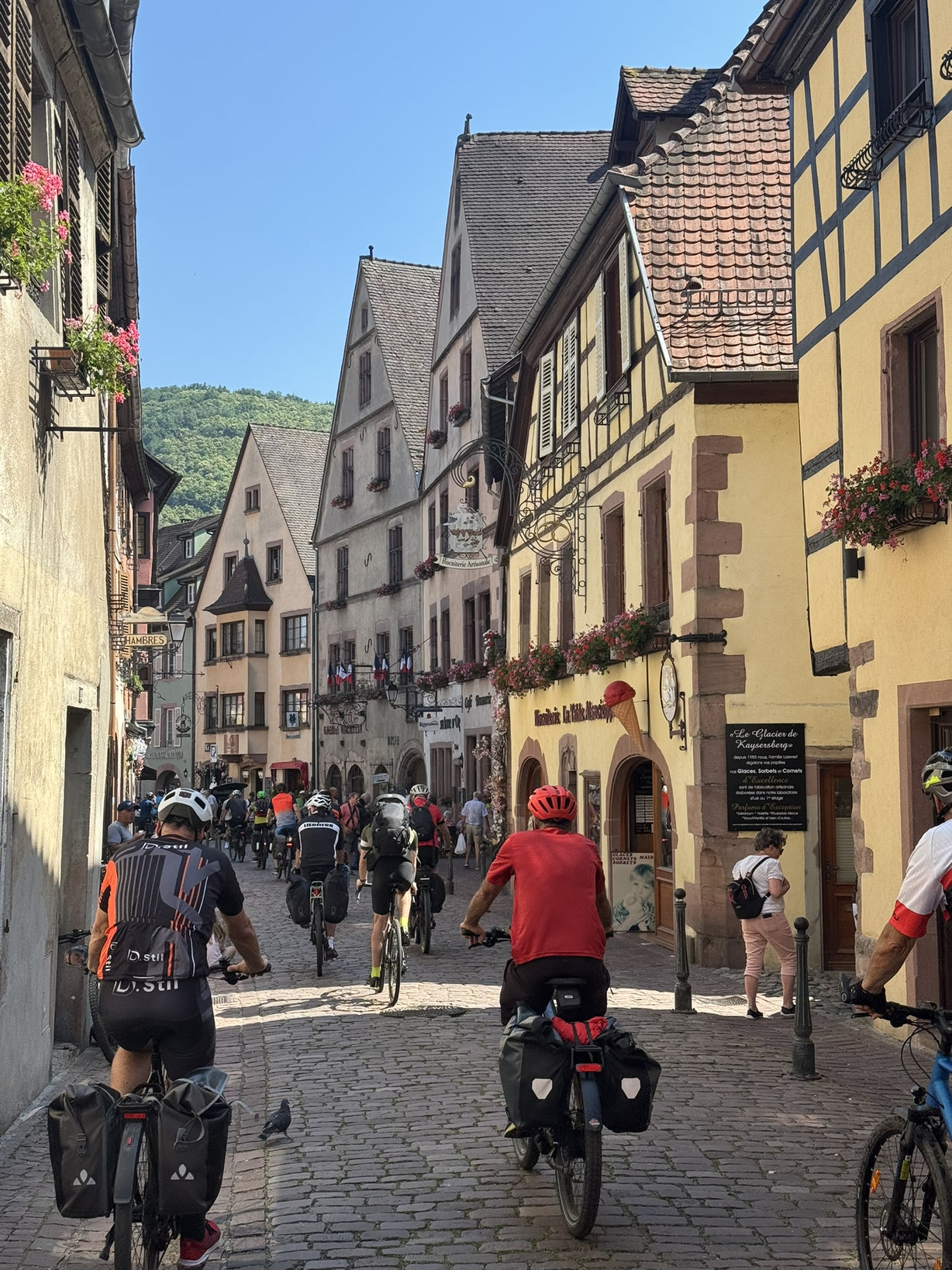 Kaysersberg ist ein pitoresker und typischer Ort im Elsass mit vielen Fachwerkbauten und tollen An- und Aussichten. Die durchaus touristische Auslegung war nicht zu verkennen. Einmal umrundeten wir die Altstadt komplett, bevor wird für eine Pause eine sehr ordentliche Bar übernahmen, inkl. erfrischenden Getränken. Bei guter Laune erfreuten wir uns über die bis dahin schon geschafften 70Km und ließen Beine und Seele mal ein, fast zwei Stunden baumeln.