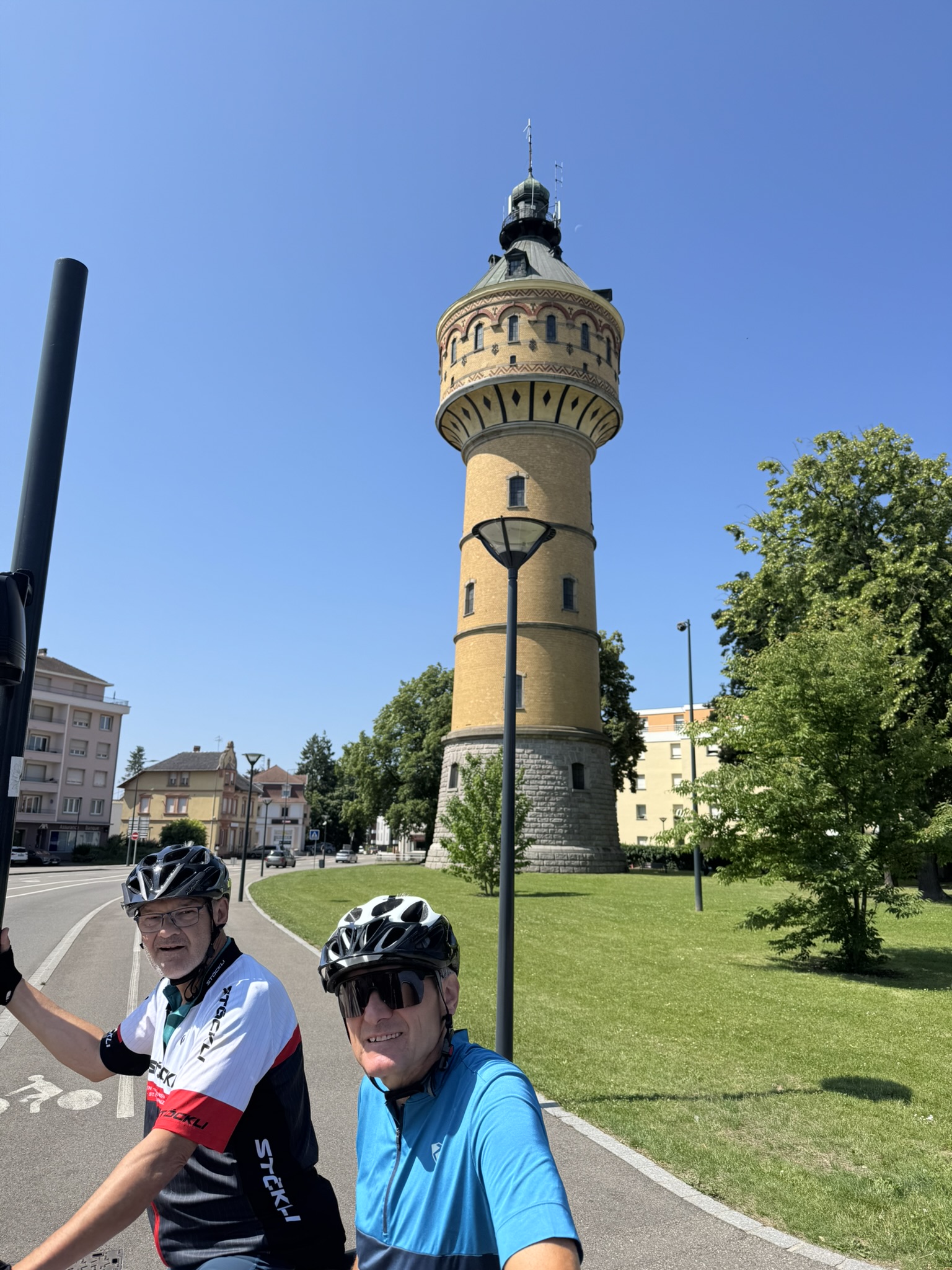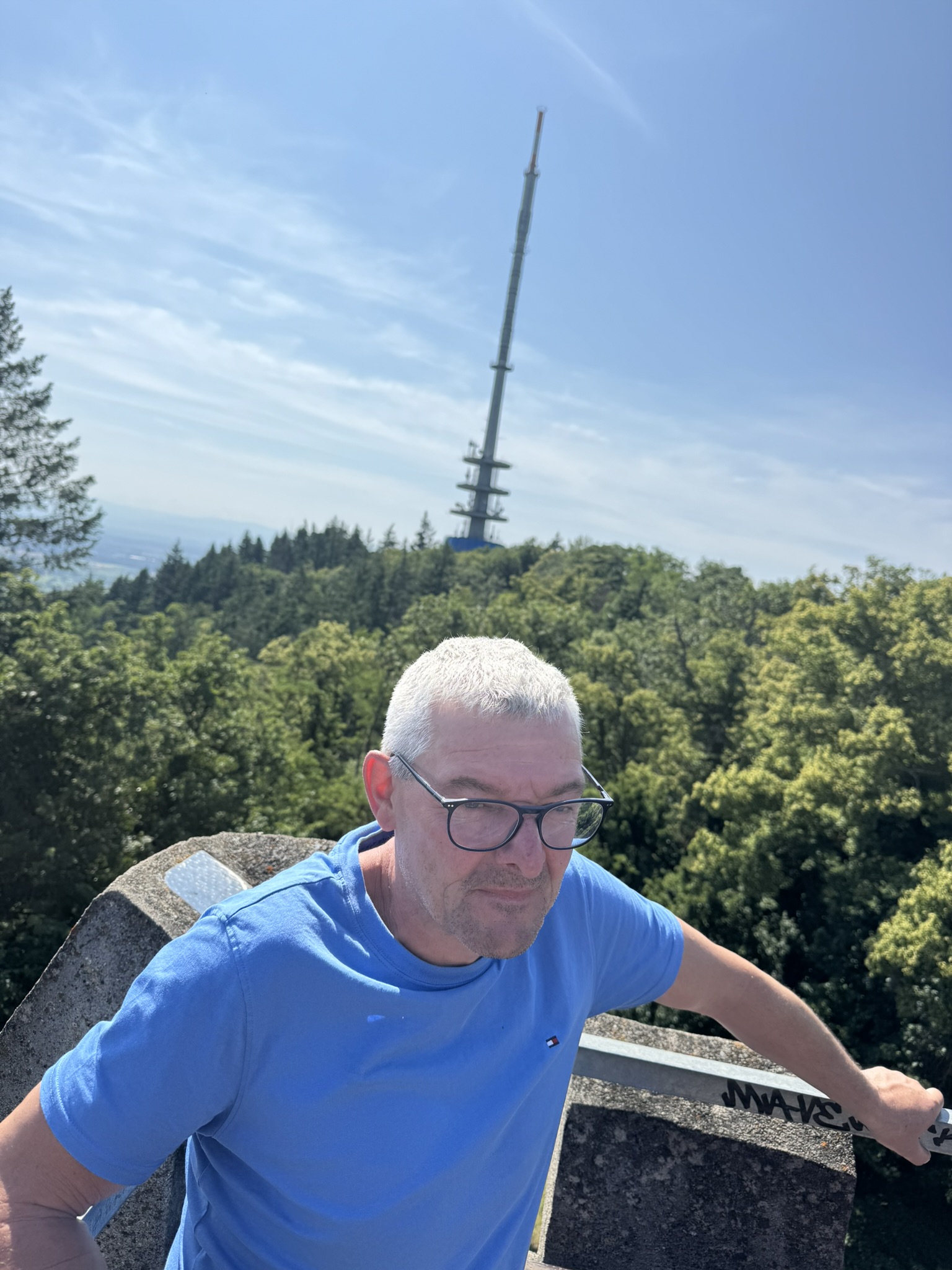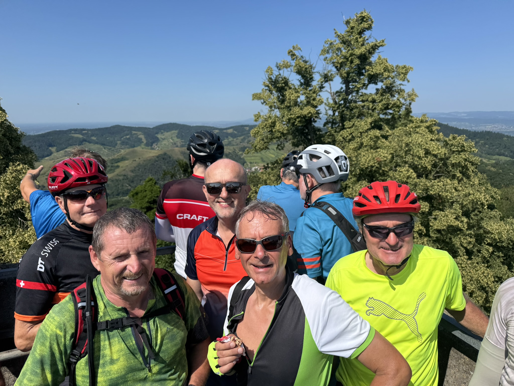 An Oberbergen vorbei führte uns der Radweg nach Bickensohl. Hier drohte der Abzweig hoch zum Totenkopfgipfel mit nochmals ordentlich Höhenmetern. 10 E-Biker und 4 Bio-Biker stellten sich der Aufgabe bis hoch auf den Neulindenturm auf 520m. Gut zu tun hatten nun alle. Vor allem der Ludwig, Roland, Peter und Thomas, die ebenfalls mit Gepäck aber ohne Motor Rampen aller Art überwanden. Oben erwartete uns eine Müsliriegel-Pause und eine atemberaubende Aussicht auf Freiburg im Breisgau und den Schwarzwald. Schauinsland und Feldberg waren namentlich zu erkennen.