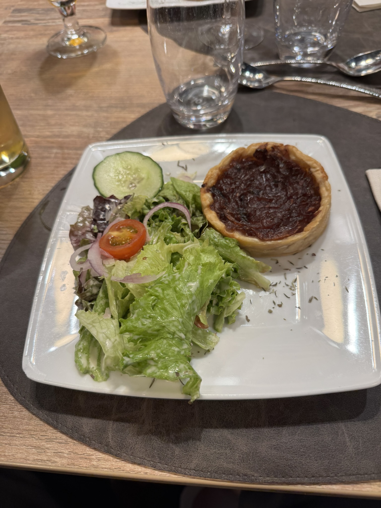 Die Vorspeise: Ein Zwiebeltörtchen, warm und sehr fein